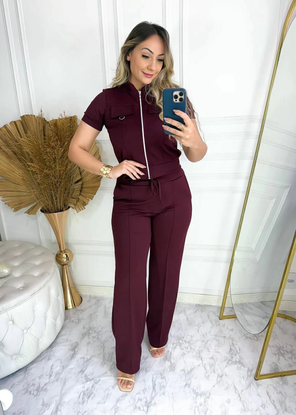 Descubra o Conjunto Serena, a escolha perfeita para quem busca estilo e praticidade em um único look. Composto por duas peças essenciais, este conjunto oferece um caimento impecável que valoriza a sua silhueta com muita elegância.